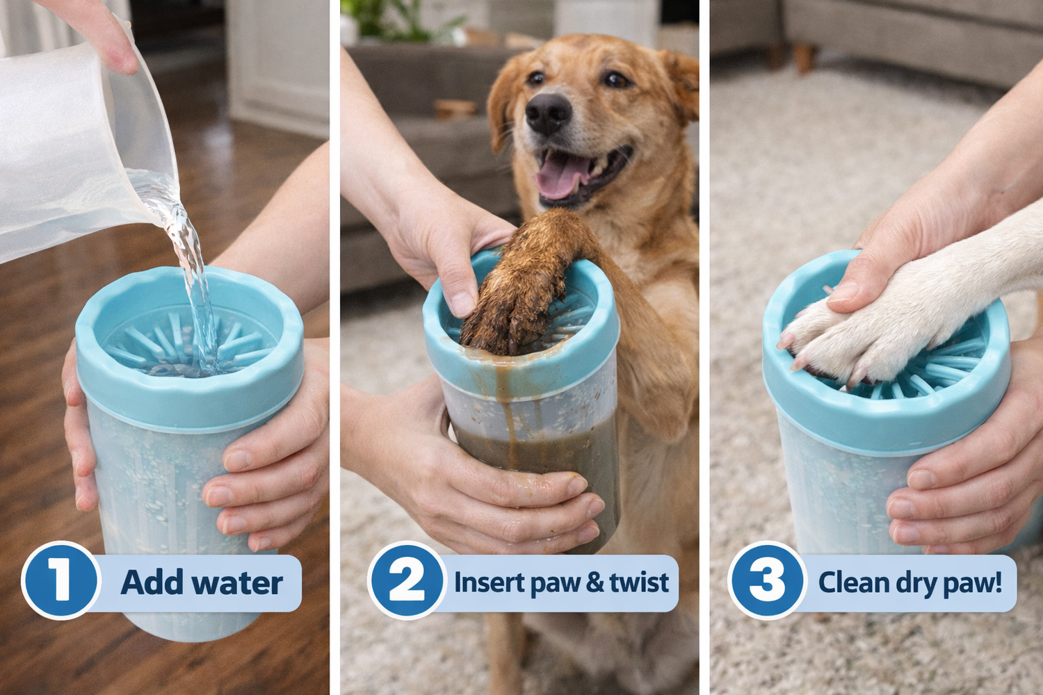 Just fill the cup halfway with lukewarm water. Too much water and it will overflow when you insert the paw — halfway is the perfect amount for an effective clean without any mess.